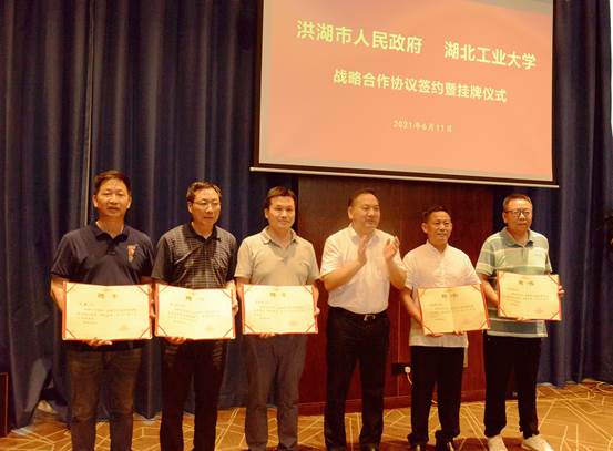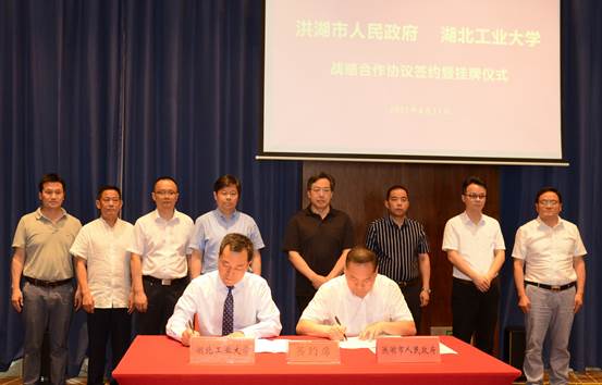 6月11日,湖北工业大学与洪湖市人民政府签署战略合作协议并举行挂牌仪式,校党委书记刘德富、洪湖市委书记伍昌军、洪湖市委副书记、市长沈先武、市主要领导、洪湖市相关部门负责人、企业代表,出席签约暨挂牌仪式。